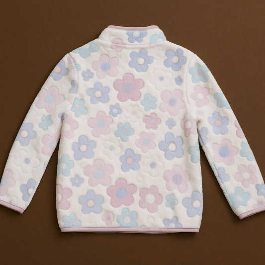 pastel Floral Fleece Jacket for Girls – Soft Zip-Up Kids Outerwear