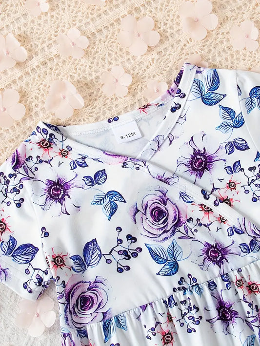 Cotton Solid & Floral-print Spliced Lace Flutter-sleeve Romper with Headband Set