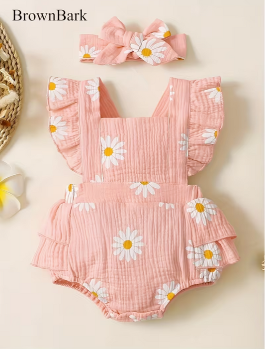 Baby Girl Cute Daisy Flutter Sleeve Romper with Headband