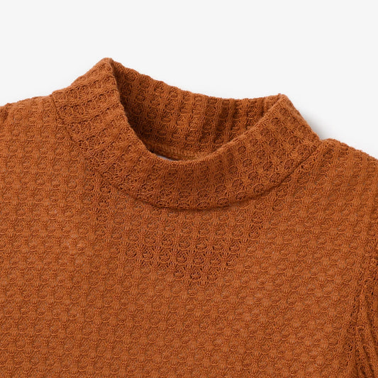 Solid Color Mock Neck Waffle Long Puff-sleeve Dress