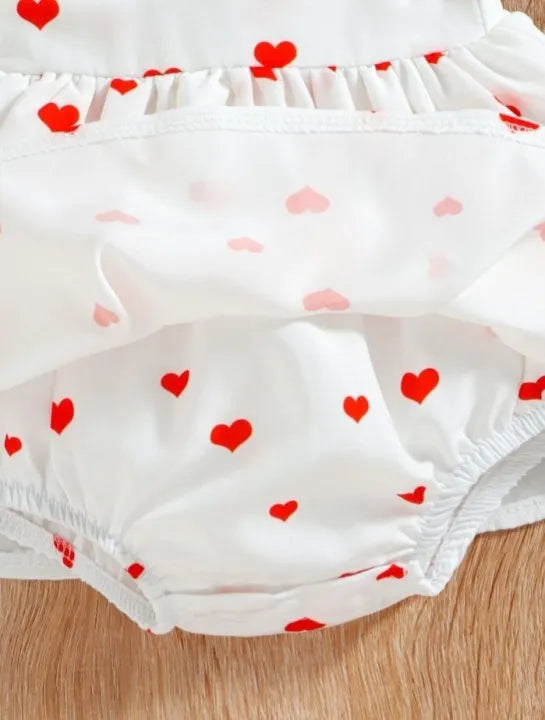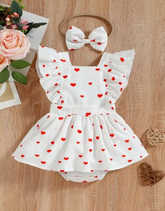 Baby Solid heart print Spliced Lace Flutter-sleeve Romper with Headband Set