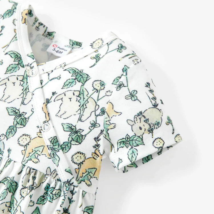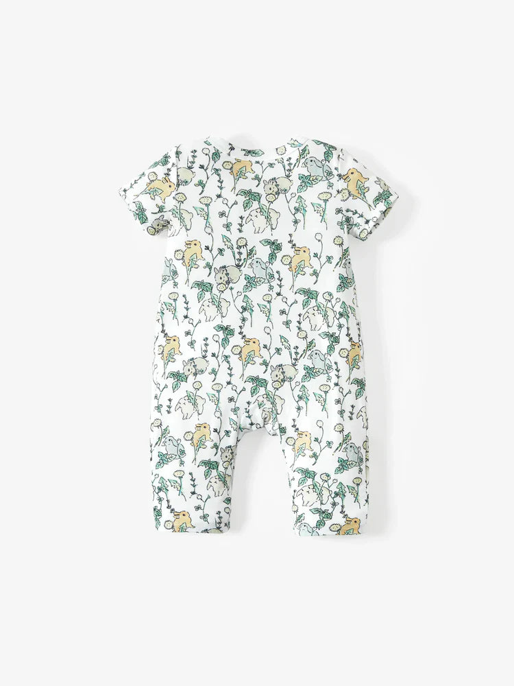 Comfy and playful baby girl rabbit print/solid jumpsuit with front snaps to make dressing easy.