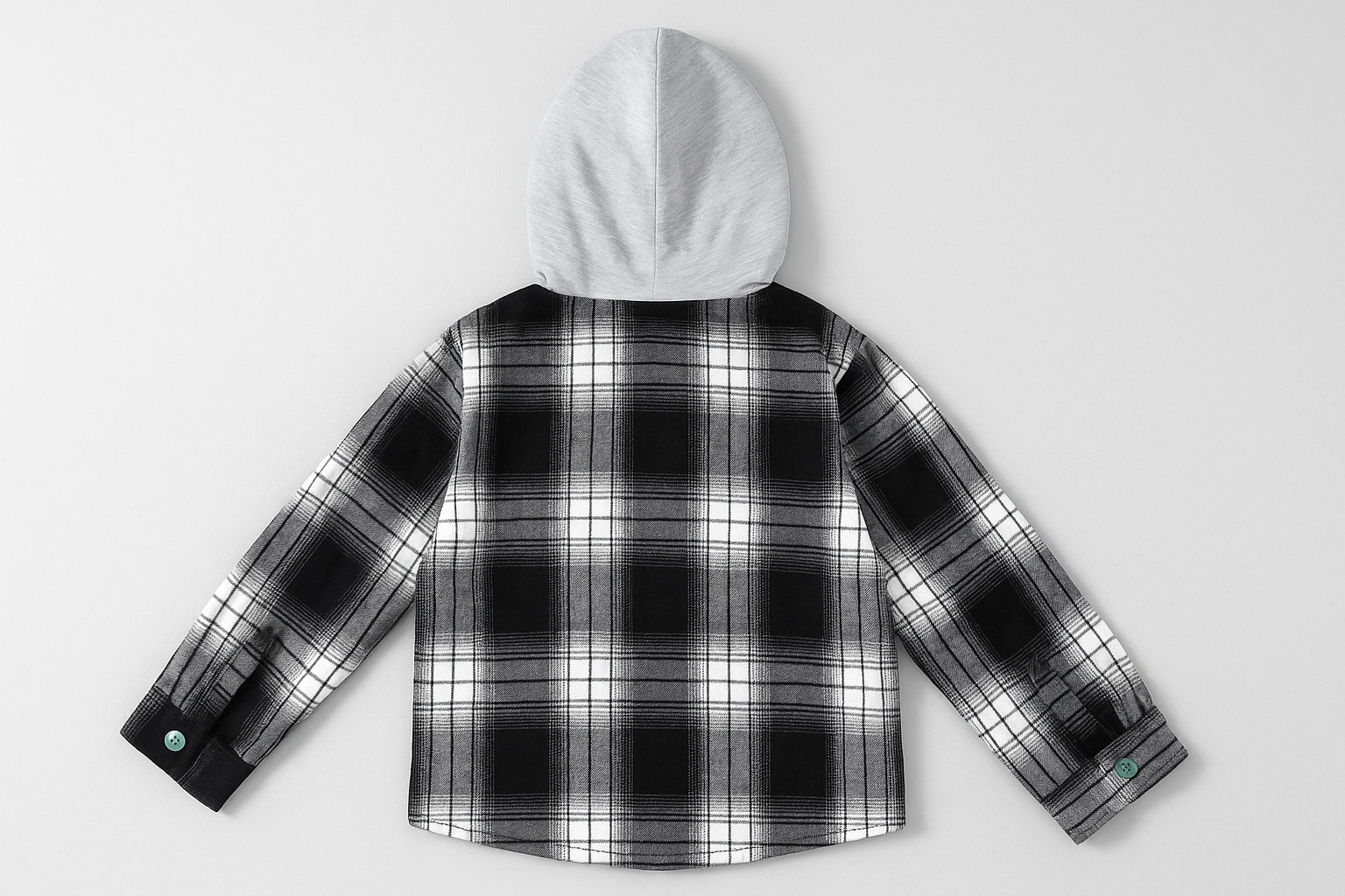This stylish layered piece brings together casual comfort with a bit of edge. Featuring a bold black-and-white plaid flannel body topped with a soft grey hood, it’s designed for kids looking for both style and versatility. With long sleeves, a single breast pocket, and green snap buttons down the front, it works as a shirt or light jacket. Ideal for transitional weather, school days or weekend adventures — simply pair it with jeans or joggers for an easy everyday outfit.