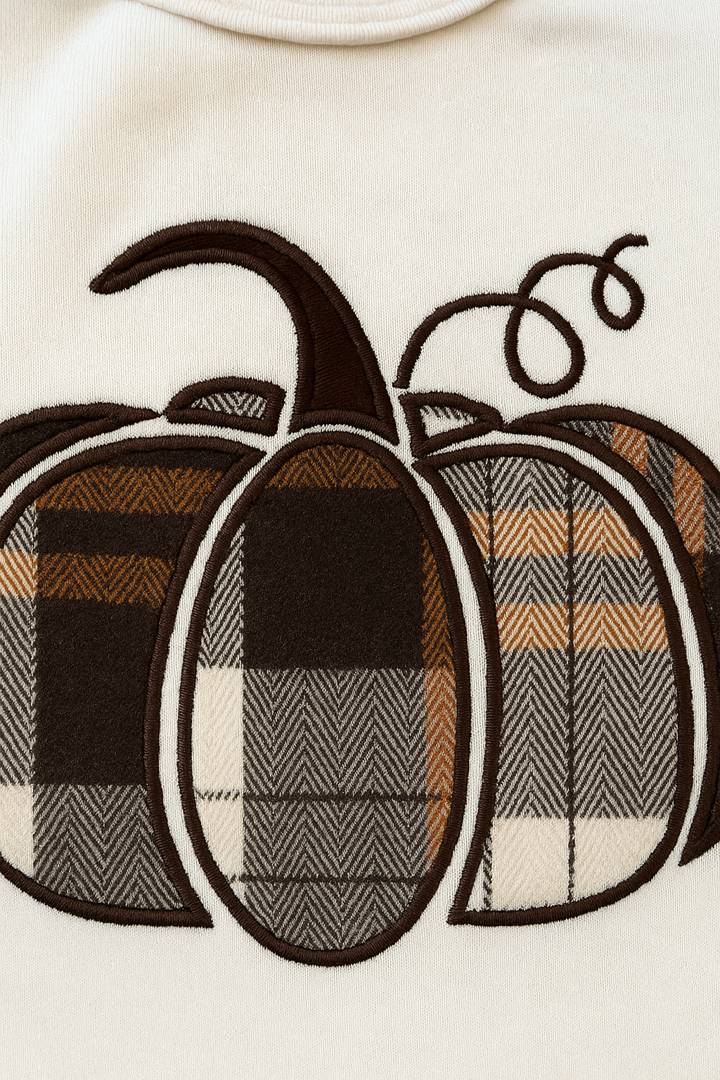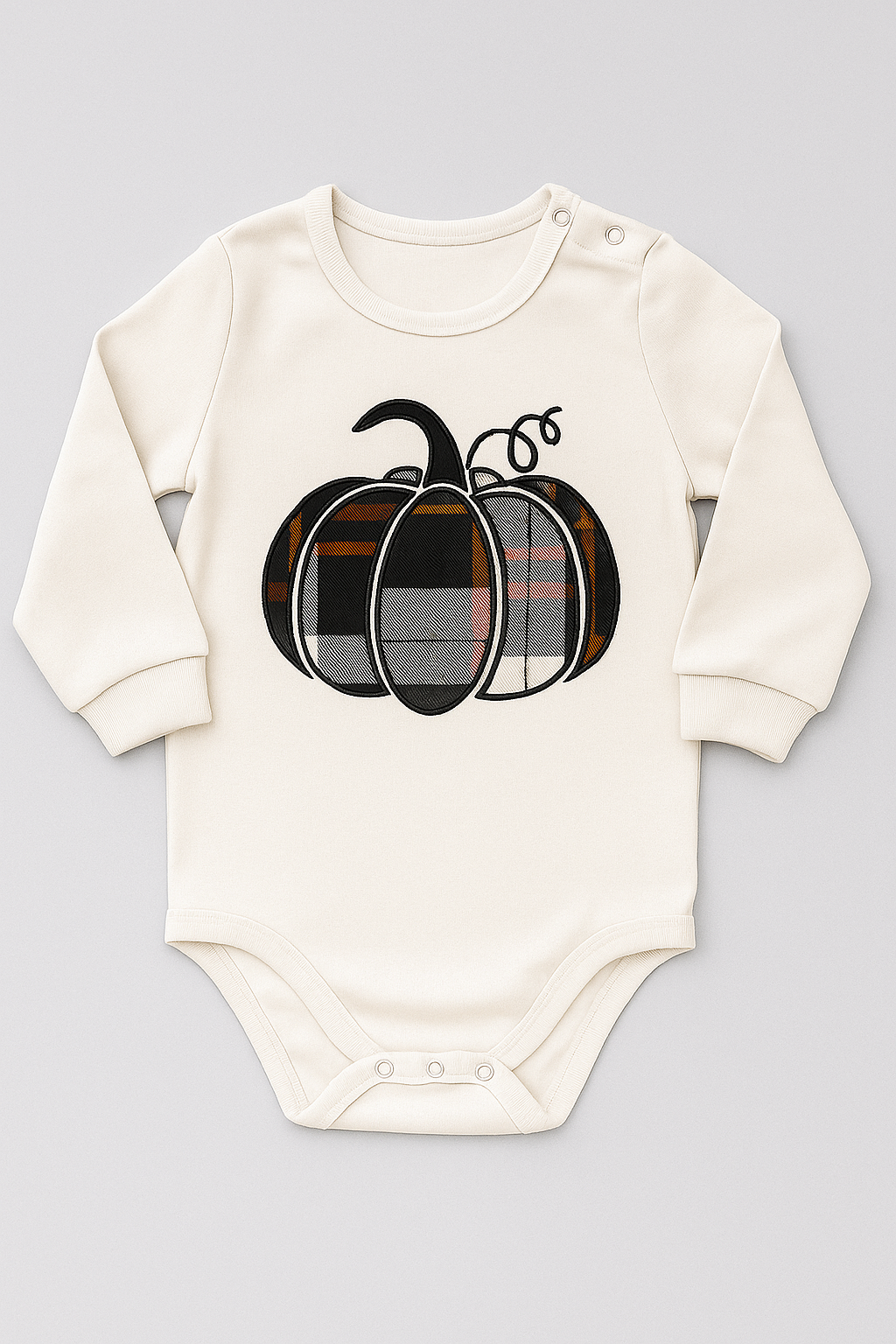 Comfy 95% cotton long-sleeved romper with bottom snaps and a Pumpkin.