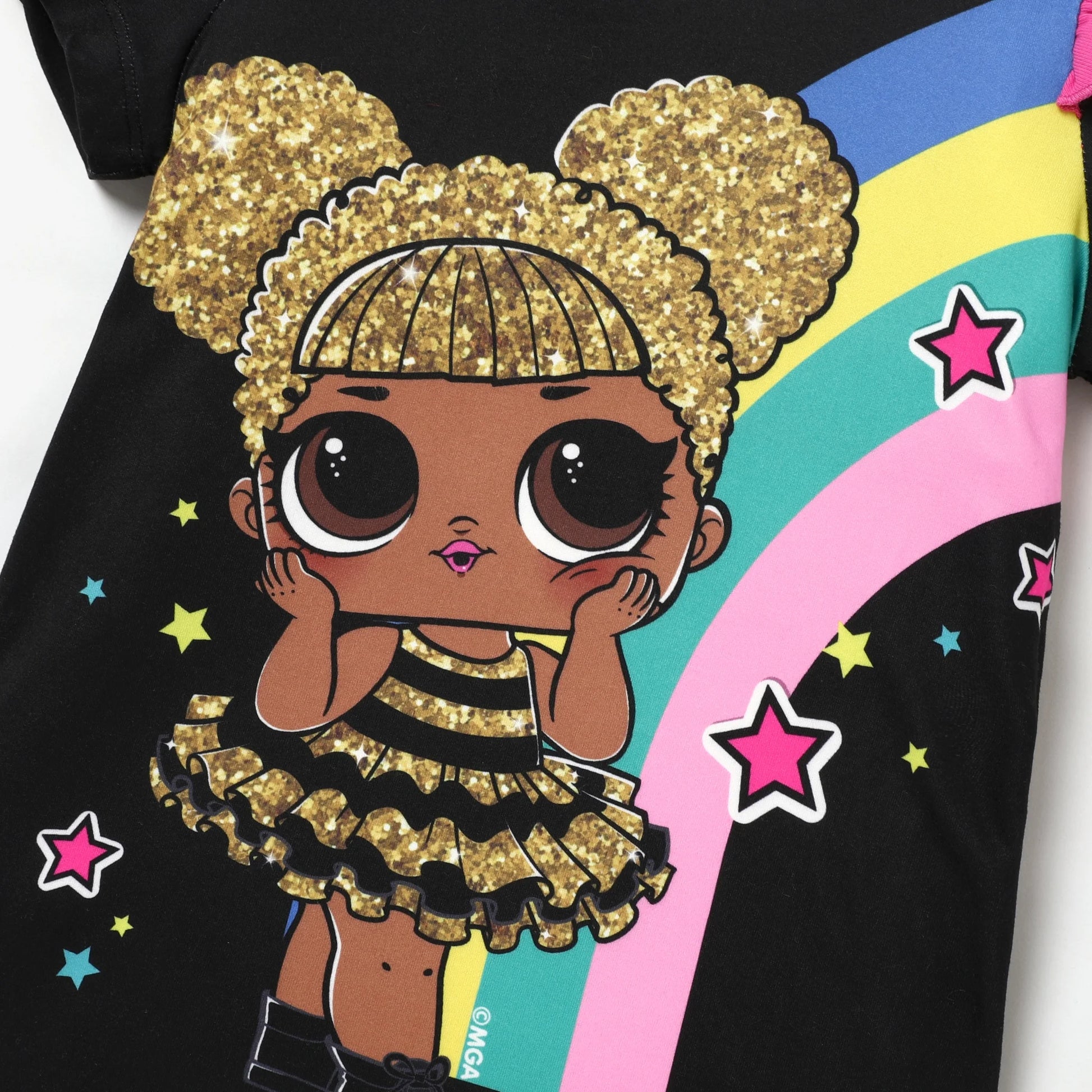 Trendy and eye-catching girls dress featuring a glamorous LOL doll-inspired graphic design. Designed on a classic black base with vibrant rainbow accents and sparkling gold details, this dress adds a fun and fashionable touch to your little one’s wardrobe.