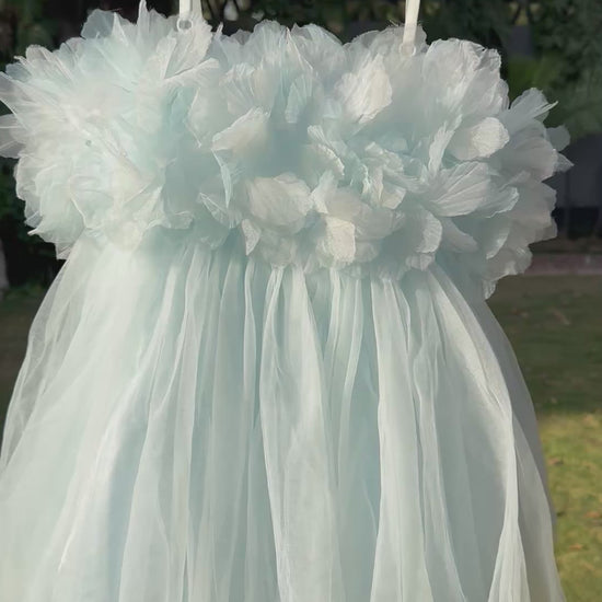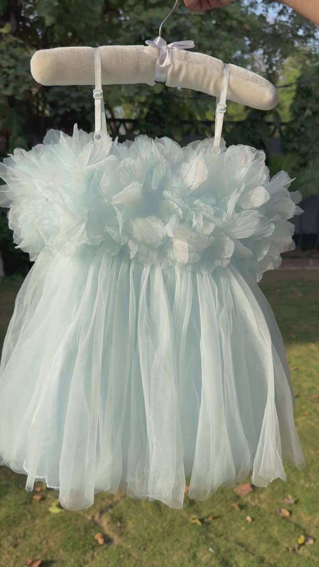 A dreamy pastel blue party dress designed with delicate 3D floral detailing on the bodice and a soft layered tulle skirt. Perfect for birthdays, weddings, and special occasions, giving your little princess an elegant fairy-tale look.