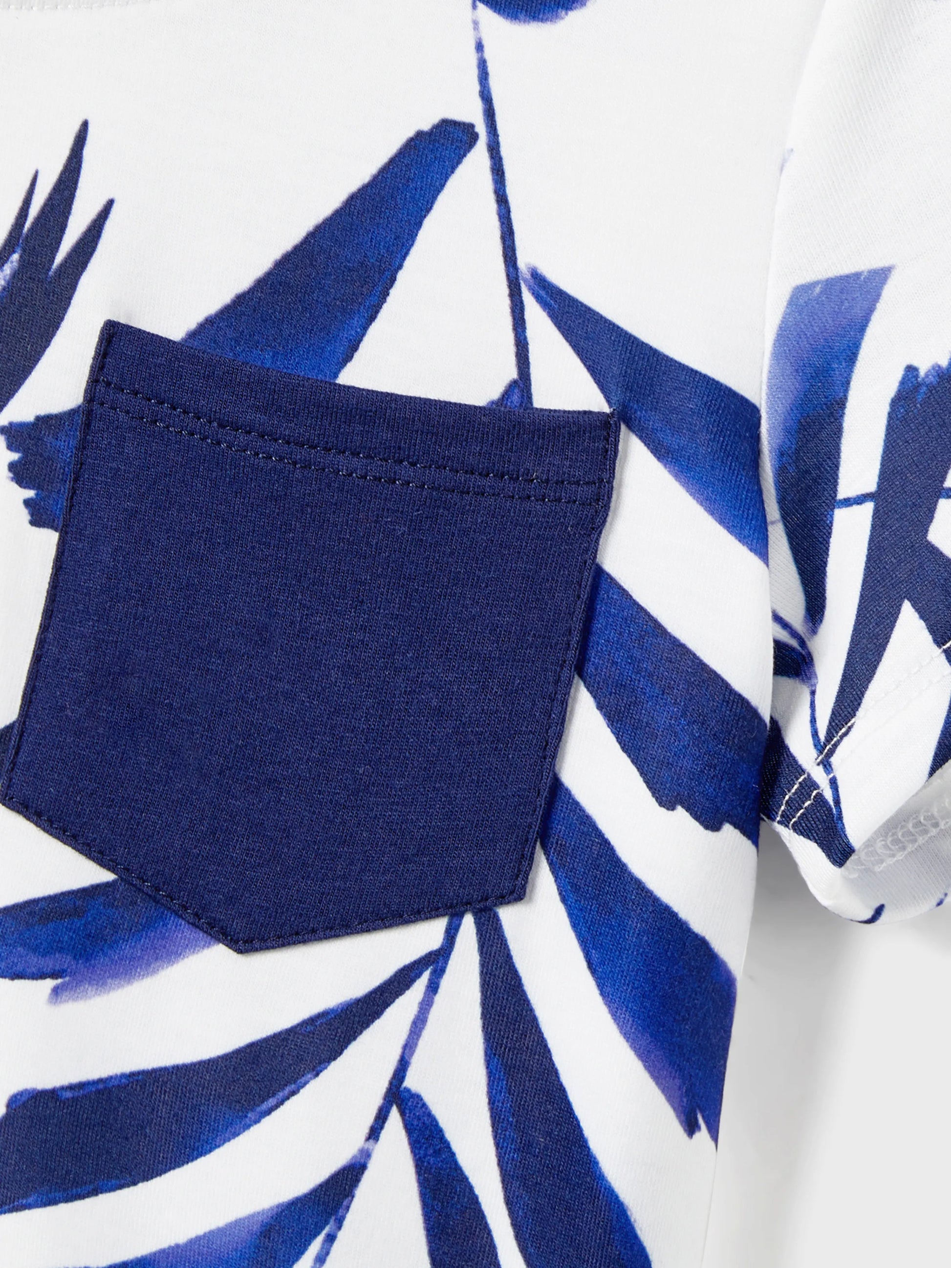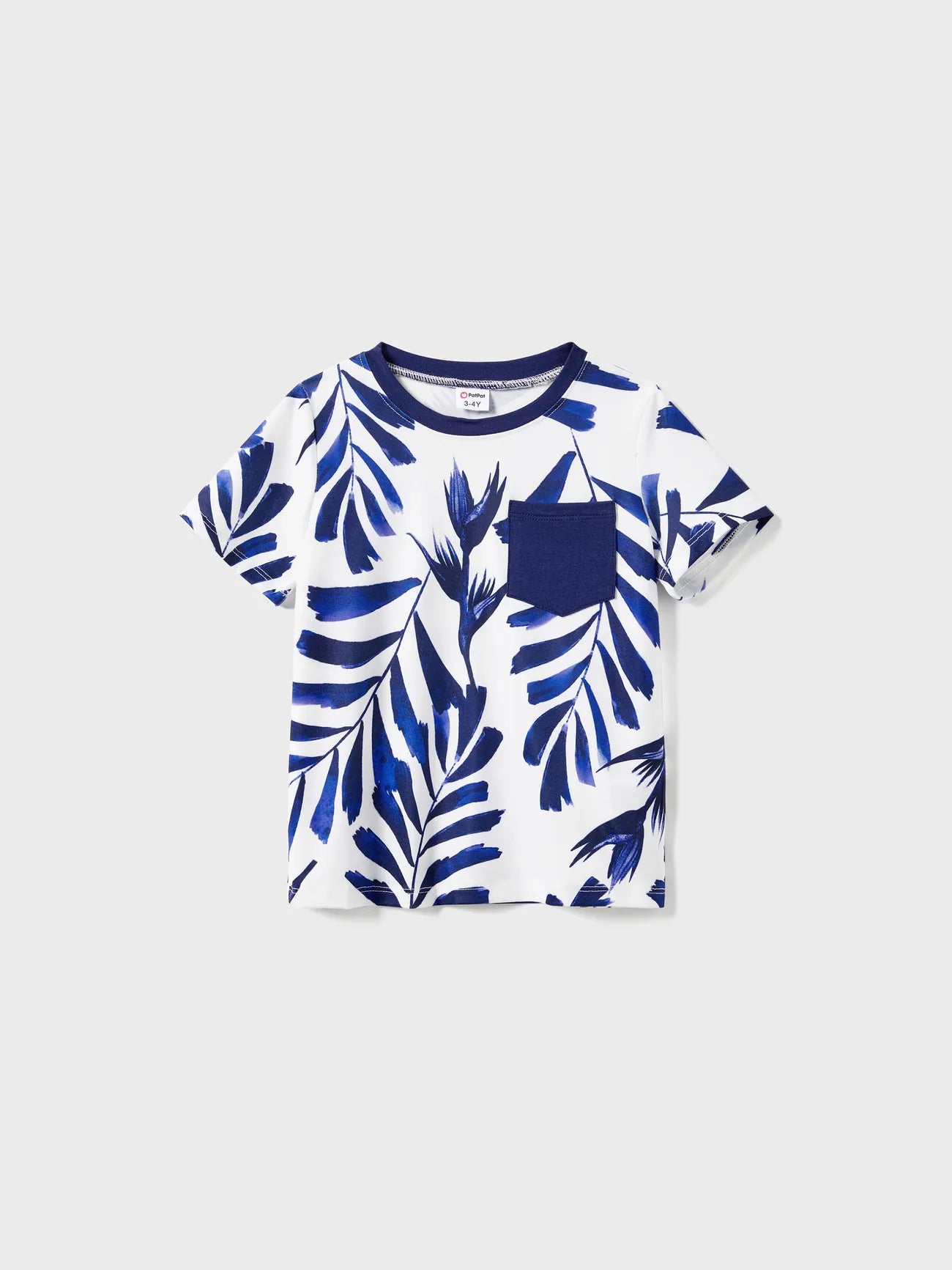 Modern Blue and White Botanical Leaf Design Button Strap Dress and Color Block Tee