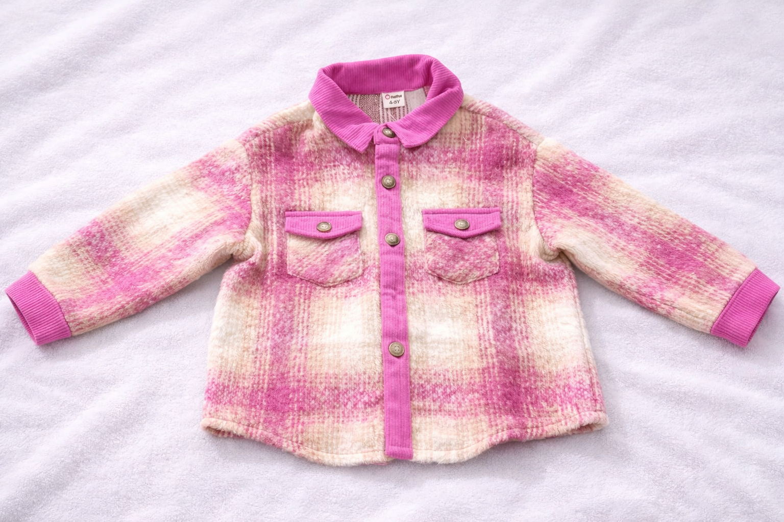 Add a touch of playful charm to your little one’s wardrobe with this stylish girls’ pink plaid jacket. Featuring a classic button-front design and a vibrant pink check pattern, it’s perfect for layering over tees and tops during transitional weather. Crafted from a soft woven fabric, this jacket includes front pockets and contrasting trim at the cuffs and collar for added detail. Whether she’s heading to school, playdates, or weekend outings, this versatile piece brings warmth and stylish flair to everyday looks.