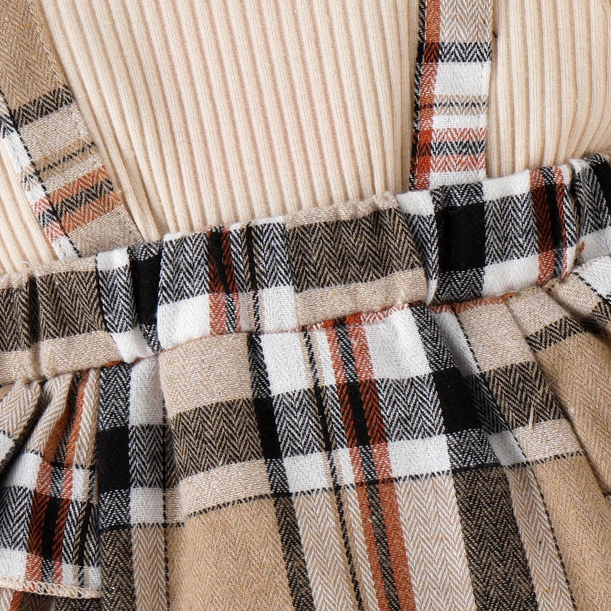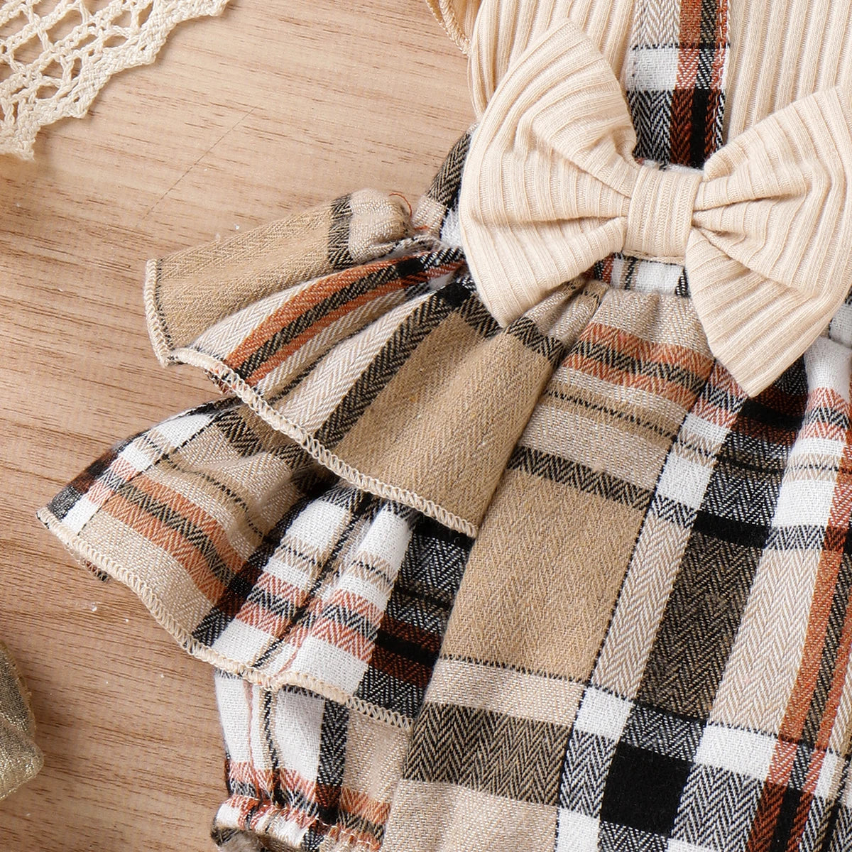 Baby Girl 95% Cotton Ribbed Ruffle-sleeve Bow Decor Spliced Plaid Romper & Headband Set